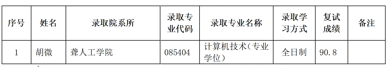 根据教育部、天津市教育招生考试院及我校相关规定,经过学生报名,学校资格审查、复试、审核,拟录取胡微等1人免试攻读天津理工大学聋人工学院2026级硕士研究生,现将拟录取名单公示如下。如有异议,请与天津理工大学聋人工学院(电话:022-60214289)联系。
